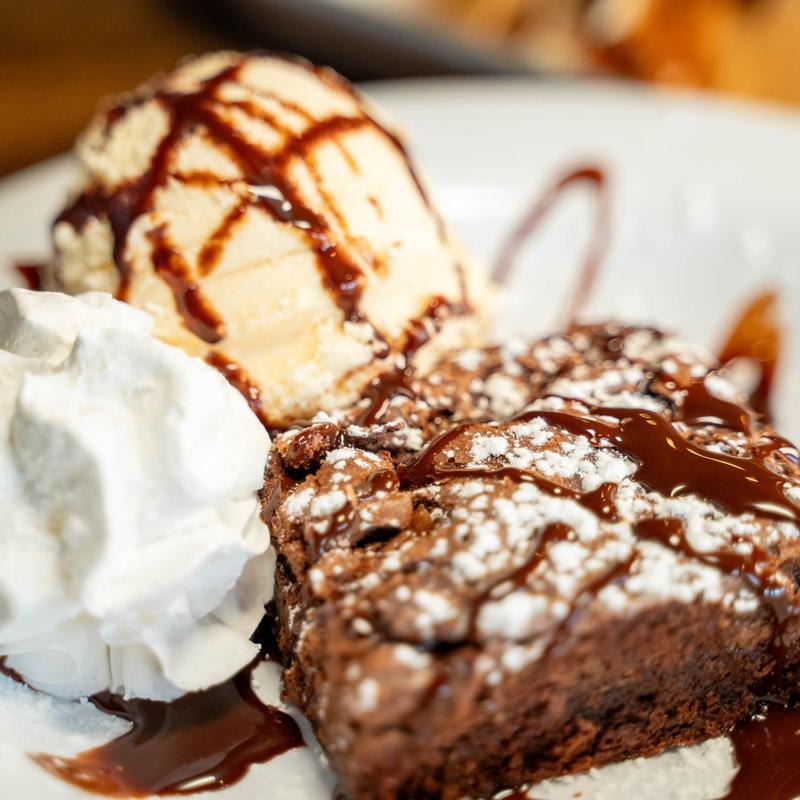 Double chocolate chip brownie warmed and topped with a scoop of vanilla ice cream & chocolate syrup