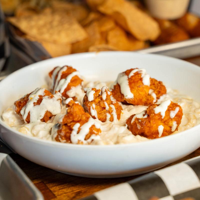 Gooey mac n cheese topped with your choice of fried or grilled chicken tossed in buffalo sauce, drizzled with ranch.