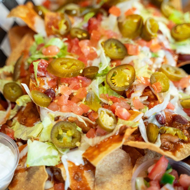 Nachos piled high with chili, cheese sauce, lettuce, tomatoes, jalapenos, & sour cream